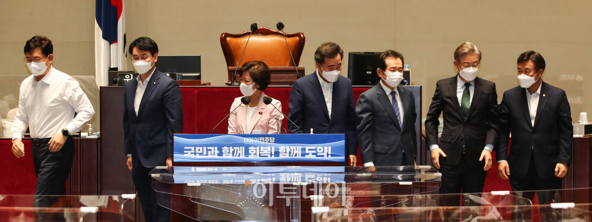 더불어민주당 송영길 대표와 대선 경선 후보들이 26일 국회에서 열린 2021년 정기국회 대비 국회의원 워크숍에서 기념촬영을 마친 뒤 자리로 돌아가고 있다. 왼쪽부터 송 대표, 박용진 후보, 추미애 후보, 이낙연 후보, 정세균 후보, 이재명 후보, 윤호중 원내대표.