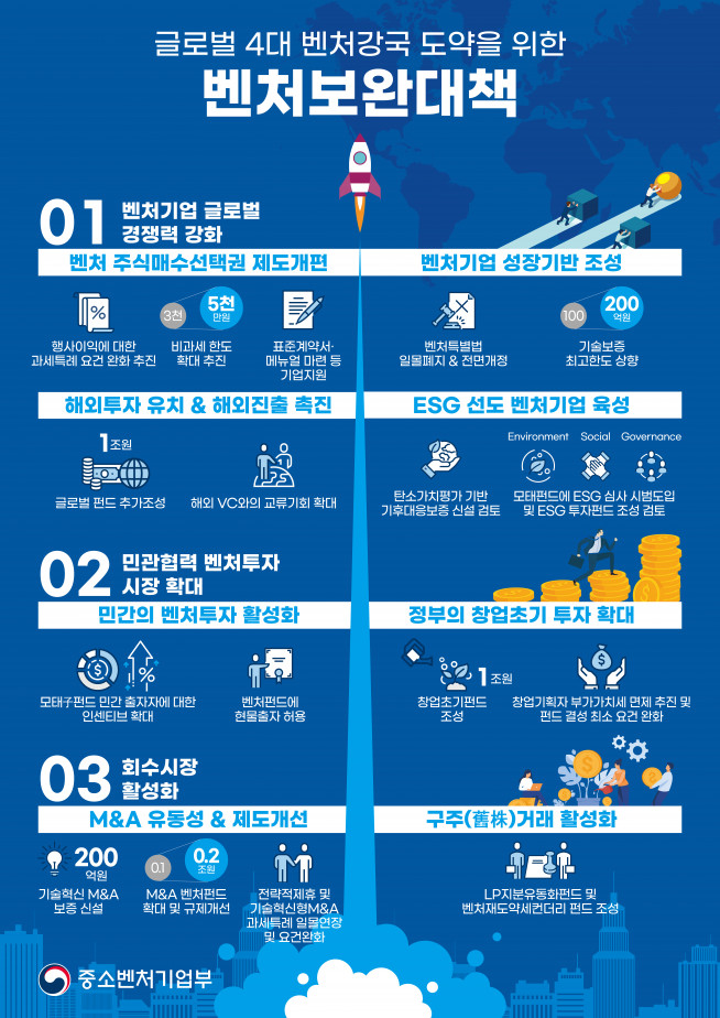 주요 내용은 벤처기업의 국제 경쟁력 강화, 벤처투자 시장 확대, 인수·합병(M&A) 등 투자 회수시장 활성화다.
