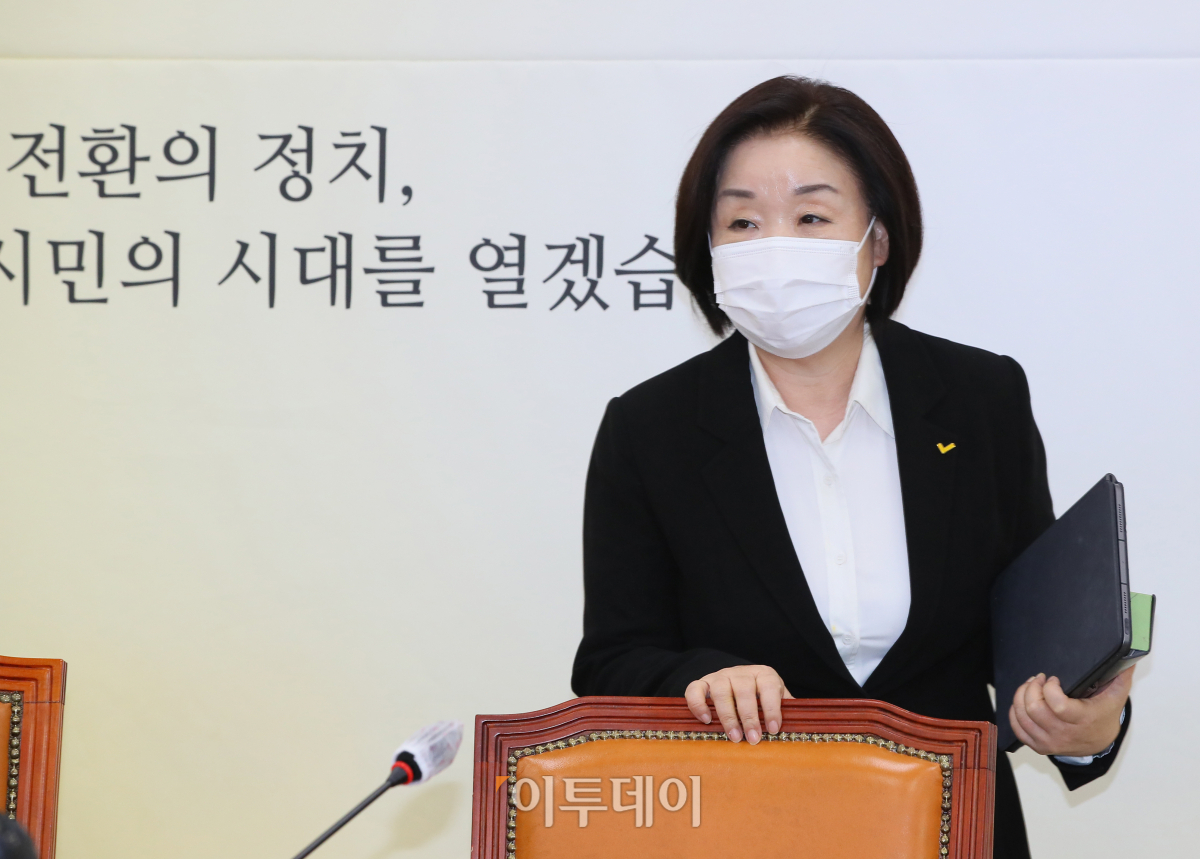 대선출마를 공식선언한 정의당 심상정 의원이 29일 서울 여의도 국회에서 대선출마에 대한 온라인 기자간담회에 입장하고 있다.