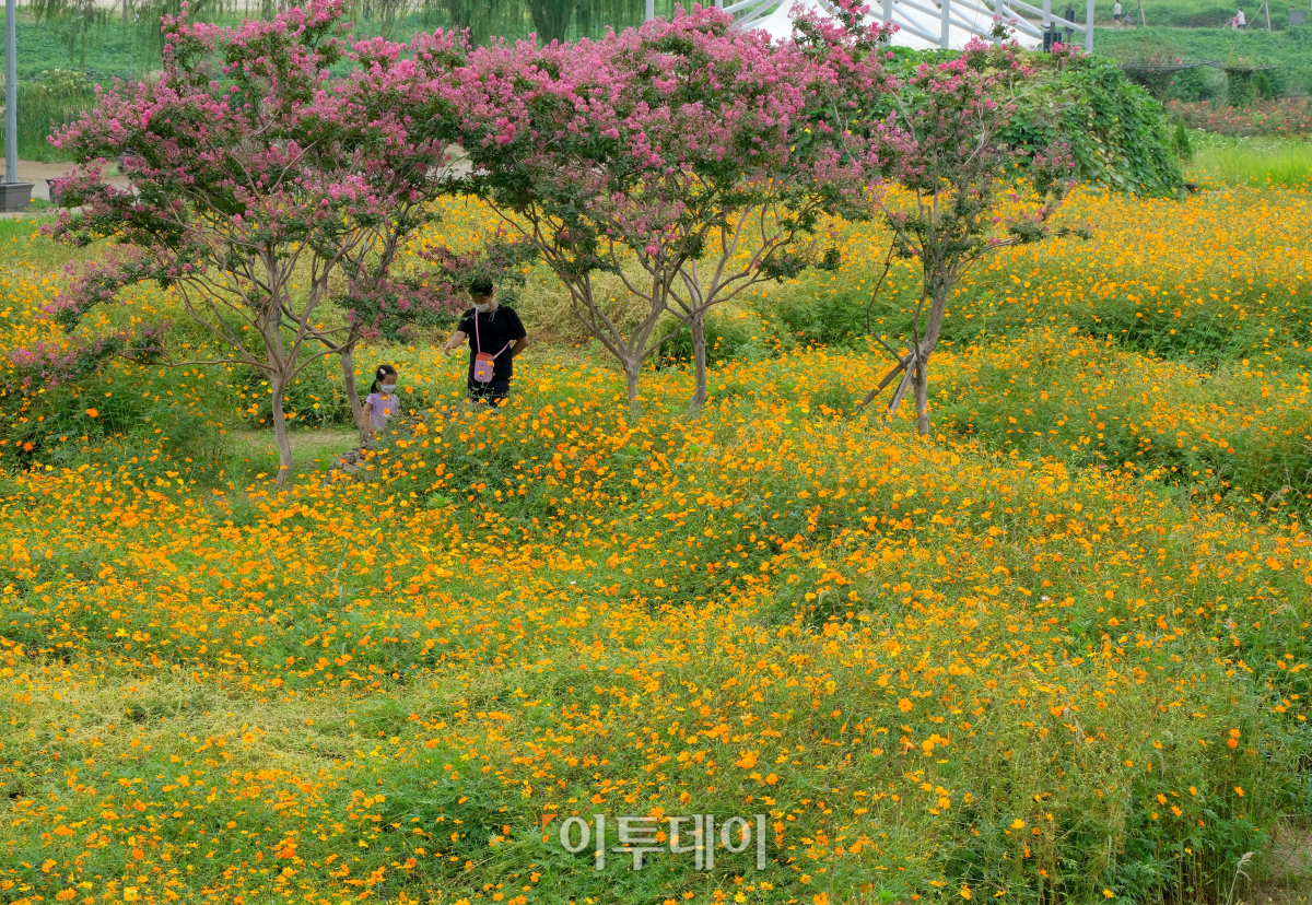 가을장마가 소강상태를 보인 29일 서울 양천구 안양천 생태공원의 배롱나무와 황화코스모스가 가을이 성큼 다가왔음을 알리고 있다.