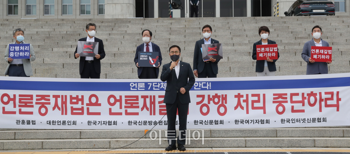 30일 여의도 국회 본청 계단에서 언론7단체장이 언론중재법 개정안 철회를 요구하는 기자회견이 열린 가운데 국민의힘 최형두 의원이 모두발언을 하고 있다.