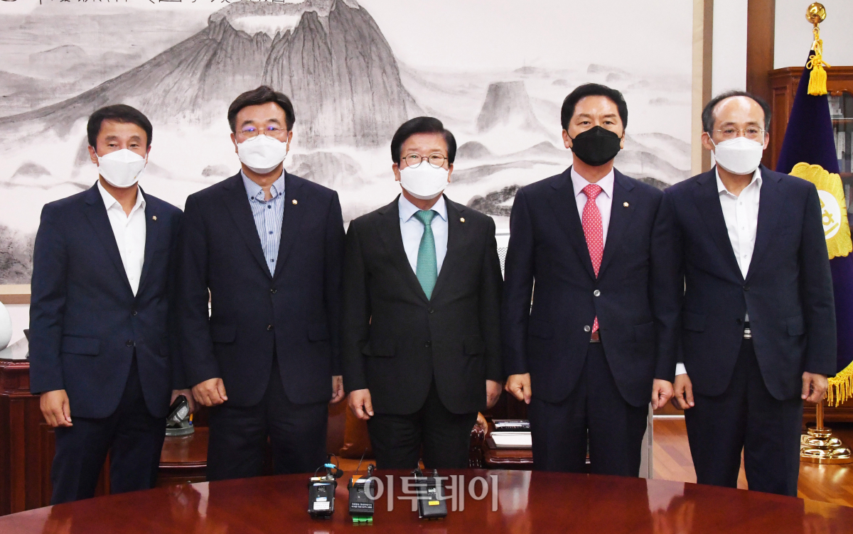 더불어민주당 한병도 원내수석부대표(왼쪽부터), 윤호중 원내대표, 박병석 국회의장, 국민의힘 김기현 원내대표, 추경호 원내수석부대표가 30일 서울 여의도 국회에서 박 의장 주재로 회동하고 있다.