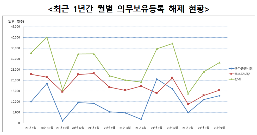 9월 중에 의무보유등록이 해제될 주식수량은 2억3961만 주를 기록한 전월 대비 18.0% 늘어난다. 3억2783만 주를 기록한 지난해 9월과 비교하면 13.8% 감소한 수준이다.