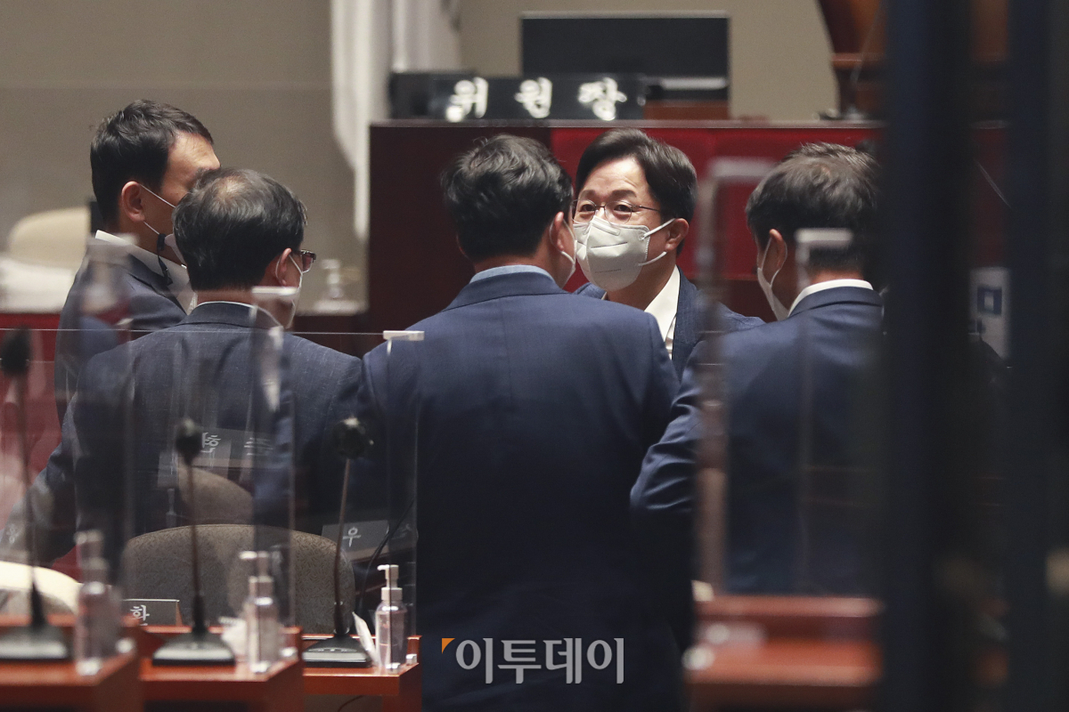 31일 오전 서울 여의도 국회에서 열린 더불어민주당 비공개 의원총회에서 참석자들이 대화를 나누고 있다.