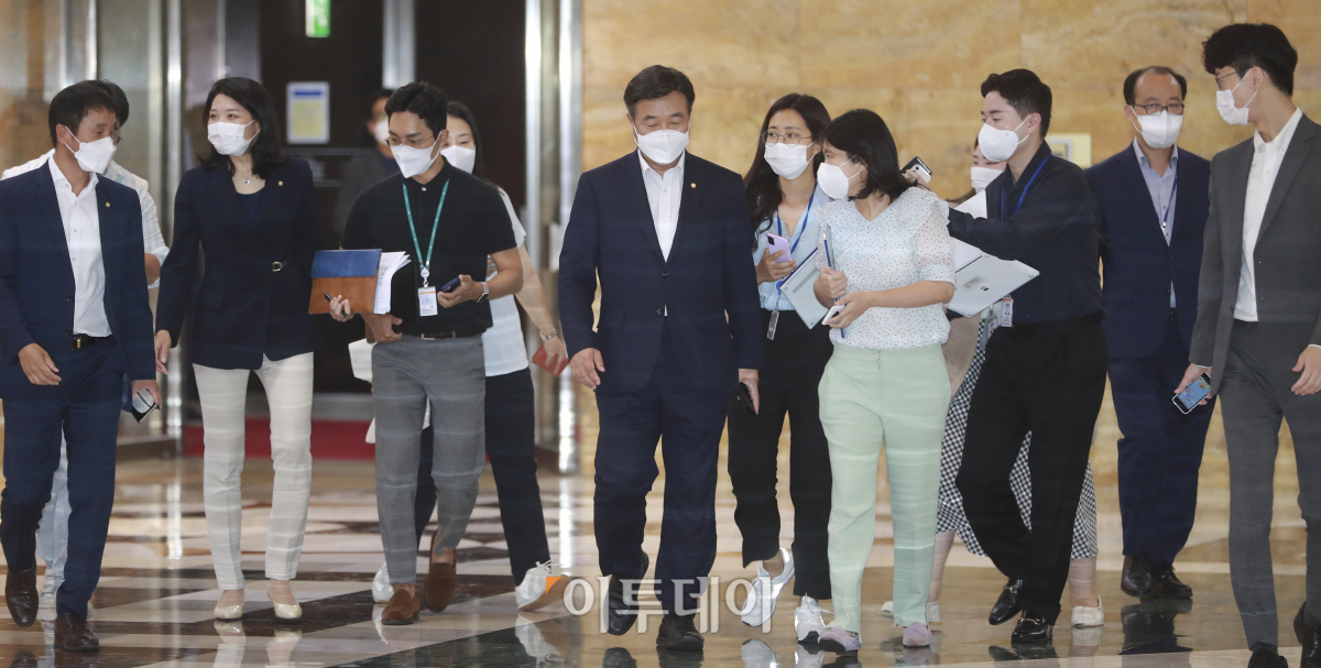 윤호중 원내대표가 31일 오전 서울 여의도 국회에서 열린 더불어민주당 비공개 의원총회에 참석하며 취재진의 질문을 받고 있다.