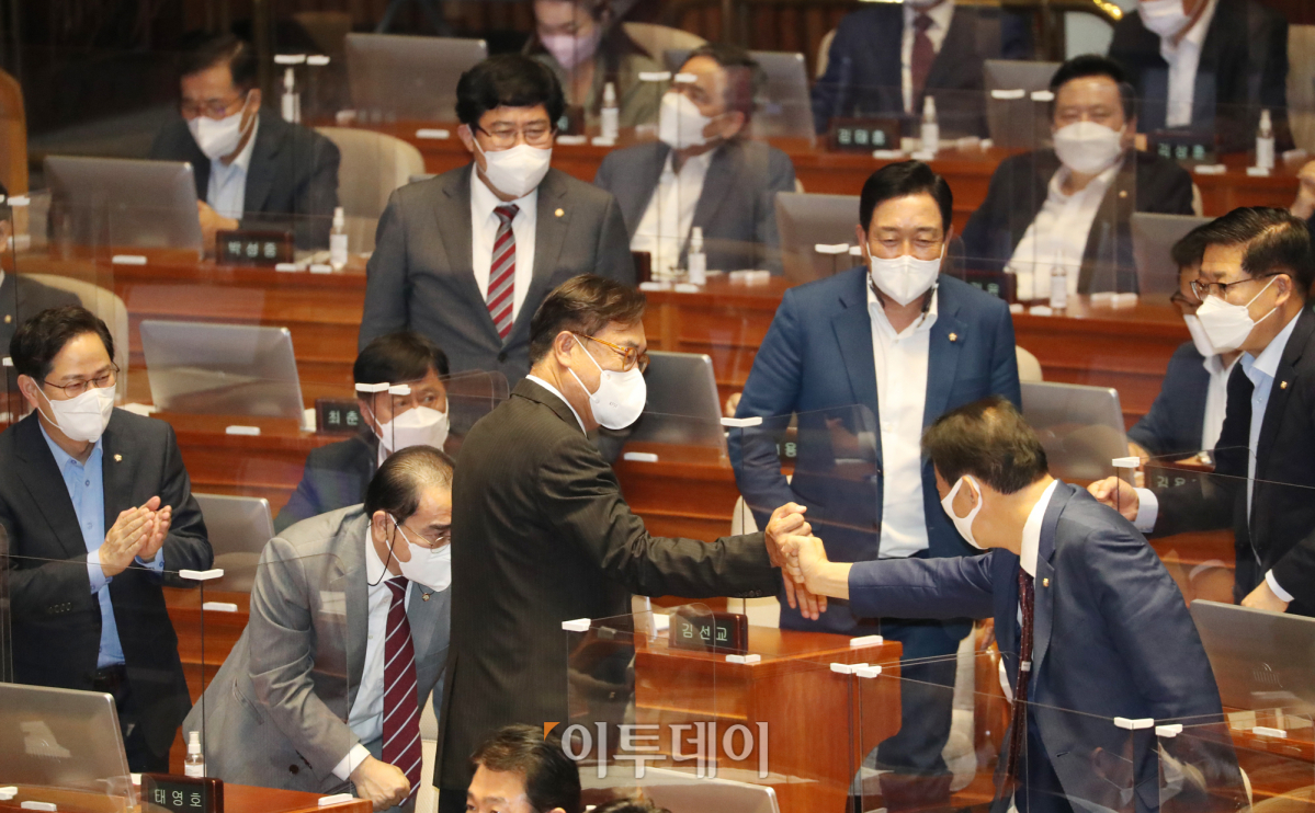 31일 국회 본회의에서 하반기 국회부의장으로 선출된 국민의힘 정진석 의원이 소감을 밝힌 뒤 자리로 돌아가며 같은당 의원들과 인사하고 있다.