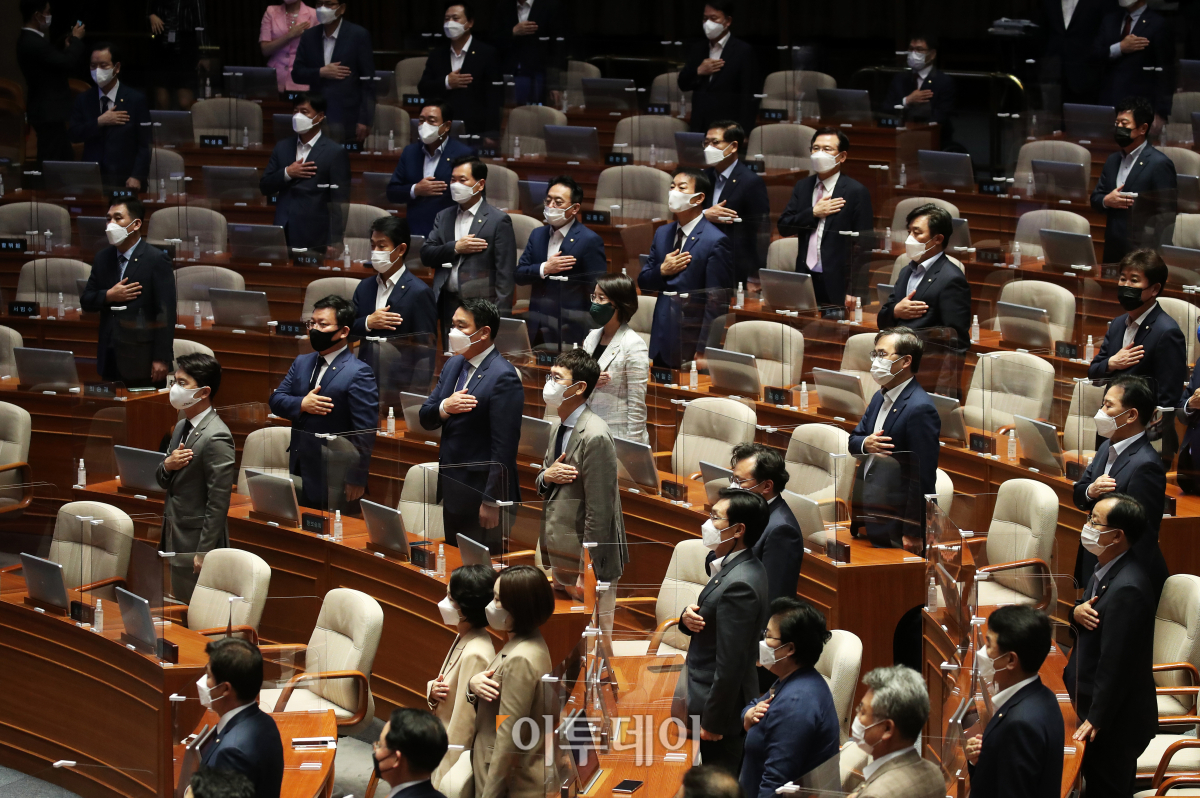 1일 오후 서울 여의도 국회 본회의장에서 열린 제391회 정기국회 개회식에서 여야 의원들이 마스크를 착용한 채 국기에 대한 경례를 하고 있다.