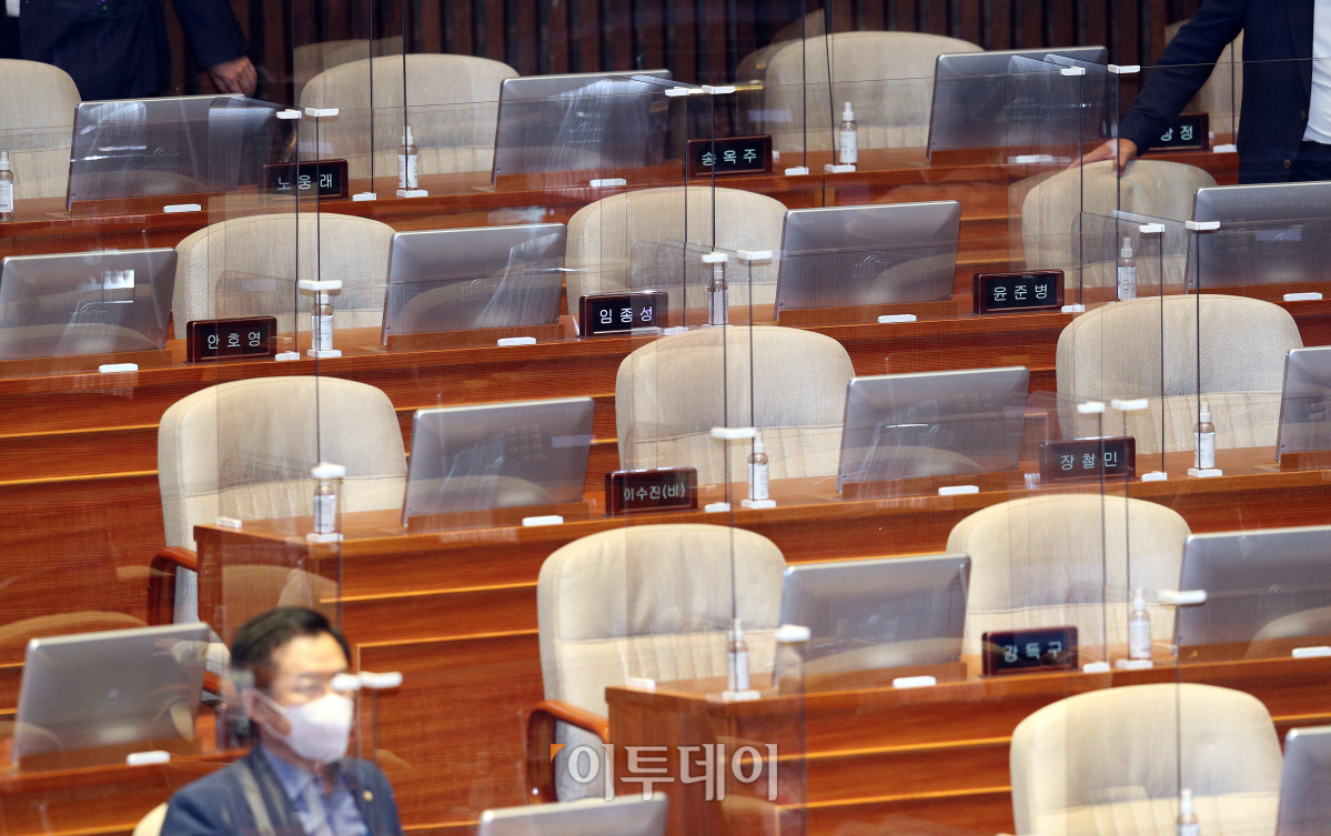 정기국회 개회식이 열린 1일 오후 국회 본회의장에서 이날 코로나19 확진 판장을 받은 임종성 더불어민주당 의원(이재명 캠프 총괄부본부장)의 자리 주변으로 의원석이 비어있다.