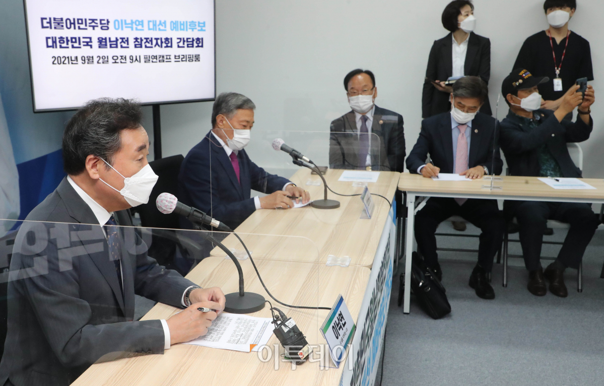 2일 오전 서울 여의도 대산빌딩에서 열린 대한민국월남전참전자회 간담회에서 더불어민주당 이낙연 경선후보가 인사말을 하고 있다.