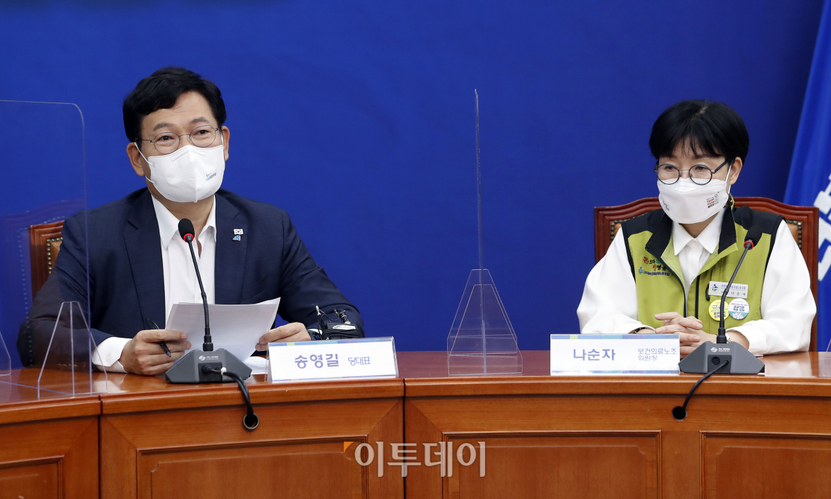 송영길 더불어민주당 대표가 2일 서울 여의도 국회에서 열린 보건의료노조와 간담회에서 발언을 하고 있다.