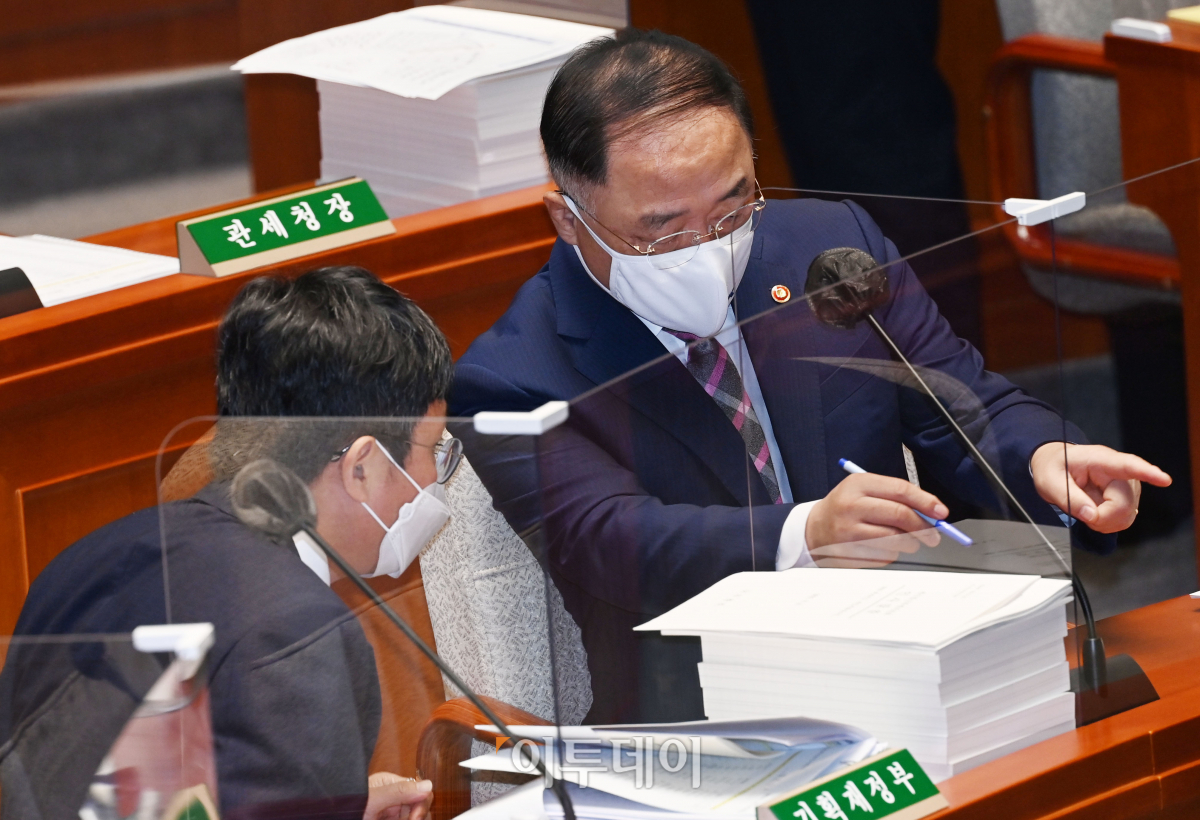 홍남기(오른쪽) 경제부총리 겸 기획재정부 장관이 6일 오전 국회에서 열린 예산결산위원회 전체회의에서 안도걸 차관과 이야기를 나누고 있다.