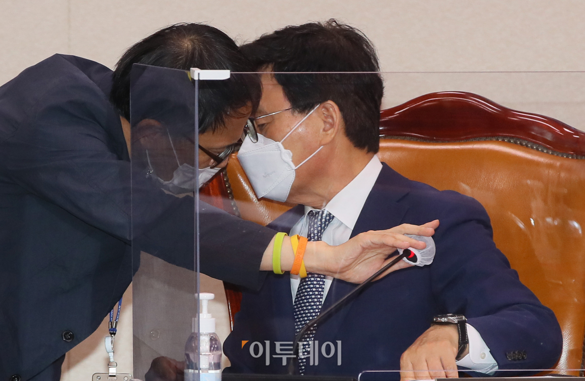 박광온 국회 법제사법위원장(오른쪽)과 더불어민주당 박주민 간사가 6일 서울 여의도 국회 법제사법위원회에서 열린 '윤석열 전 검찰총장의 고발 사주 의혹'과 관련한 현안 질의를 위한 전체회의에서 논의하고 있다. 국민의힘 권성동 의원은 이날 회의에서 공정성을 이유로 해당 현안 당사자인 최 의원의 질의 참여에 대한 여야 간사간 협의를 요청했고, 이 발언을 들은 최 의원은 여야 간사를 찾아가 각각 대화를 나눴다.