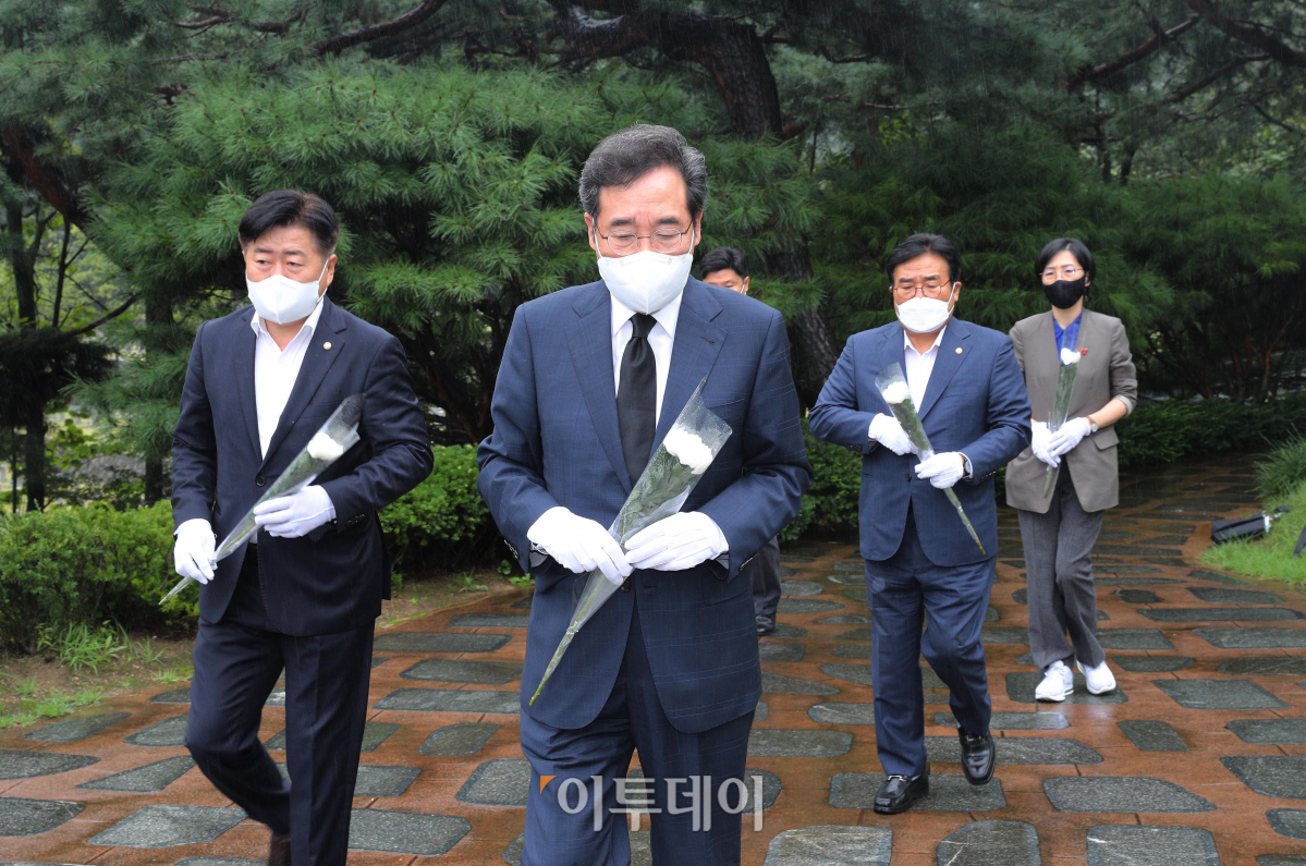 더불어민주당 대선 예비후보인 이낙연 전 대표가 7일 오후 서울 동작구 동작동 국립서울현충원 김대중 대통령 묘소를 참배하기 위해 꽃을 들고 걸어오고 있다. 국회사진취재단