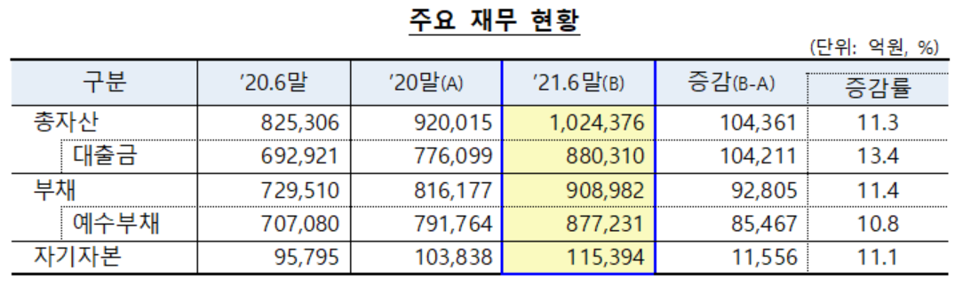 총자산은 102조4000억 원으로 2020년 말(92조 원) 대비 10조4000억 원(11.3%) 증가했다. 총대출은 88조 원으로 지난해 말(77조6000억 원) 대비 10조4000억 원(13.4%) 늘었다.