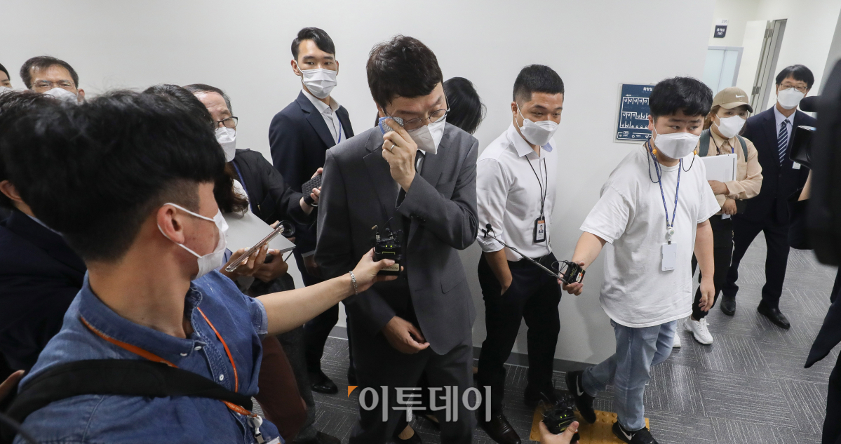 김웅 국민의힘 의원이 8일 서울 여의도 국회 소통관에서 지난해 총선 당시 윤석열 검찰총장의 측근 검사로부터 여권 인사에 대한 고발장을 넘겨받았다는 이른바 '고발사주' 의혹과 관련한 기자회견을 마친 뒤 나서고 있다.