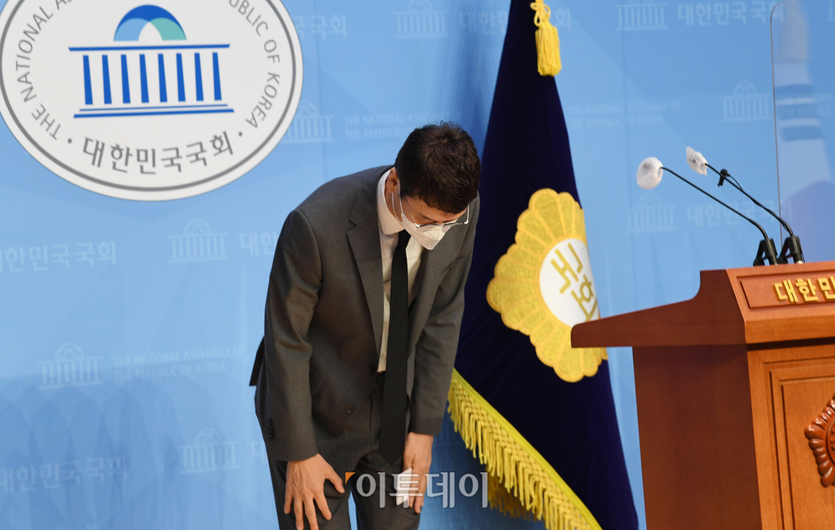 국민의힘 김웅 의원이 8일 서울 여의도 국회에서 지난해 총선 당시 윤석열 검찰총장의 측근 검사로부터 여권 인사에 대한 고발장을 넘겨받았다는 이른바 '고발사주' 의혹과 관련해 기자회견을 갖기 앞서 고개숙여 인사하고 있다.