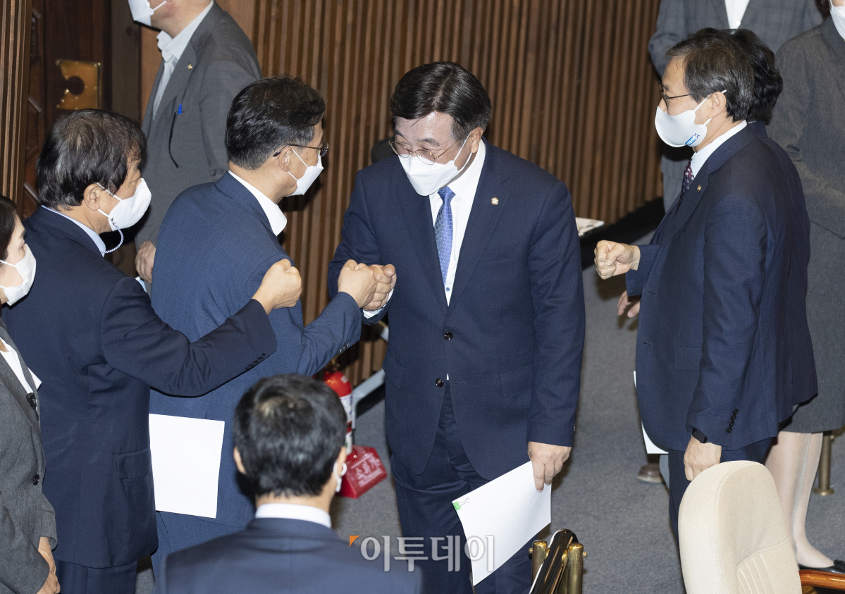 더불어민주당 윤호중 원내대표(오른쪽 둘째)가 8일 오전 국회 본회장에서 교섭단체 대표 연설을 마친 뒤 의원들과 인사하고 있다.