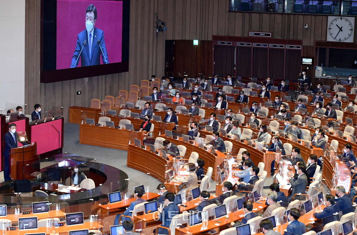 윤호중 더불어민주당 원내대표가 8일 서울 여의도 국회에서 열린 본회의에서 교섭단체 대표연설을 하고 있다.