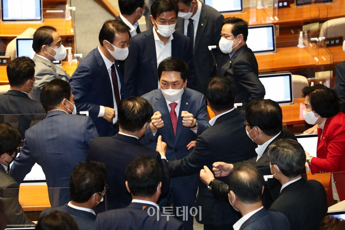 국민의힘 김기현 원내대표가 9일 국회에서 열린 제391회국회(정기회) 본회의에서 교섭단체 대표연설을 마친 뒤 의원들과 인사하고 있다.