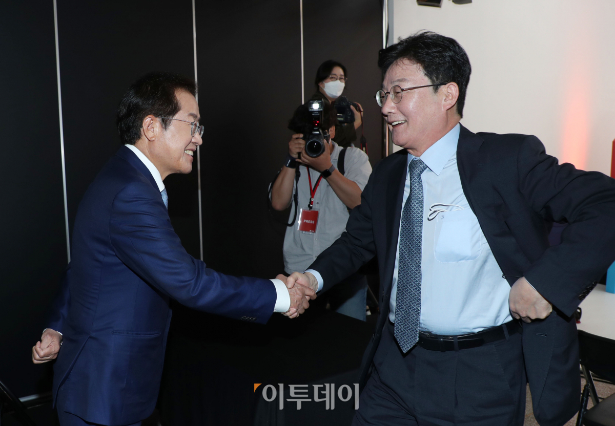 9일 서울 금천구 즐스튜디오에서 열린 국민의힘 대선 경선 후보 국민 시그널 공개면접에 참가한 홍준표 후보(왼쪽)가 먼저 면접을 치르고 나서는 유승민 후보와 반갑게 인사를 나누고 있다. 국회사진취재단