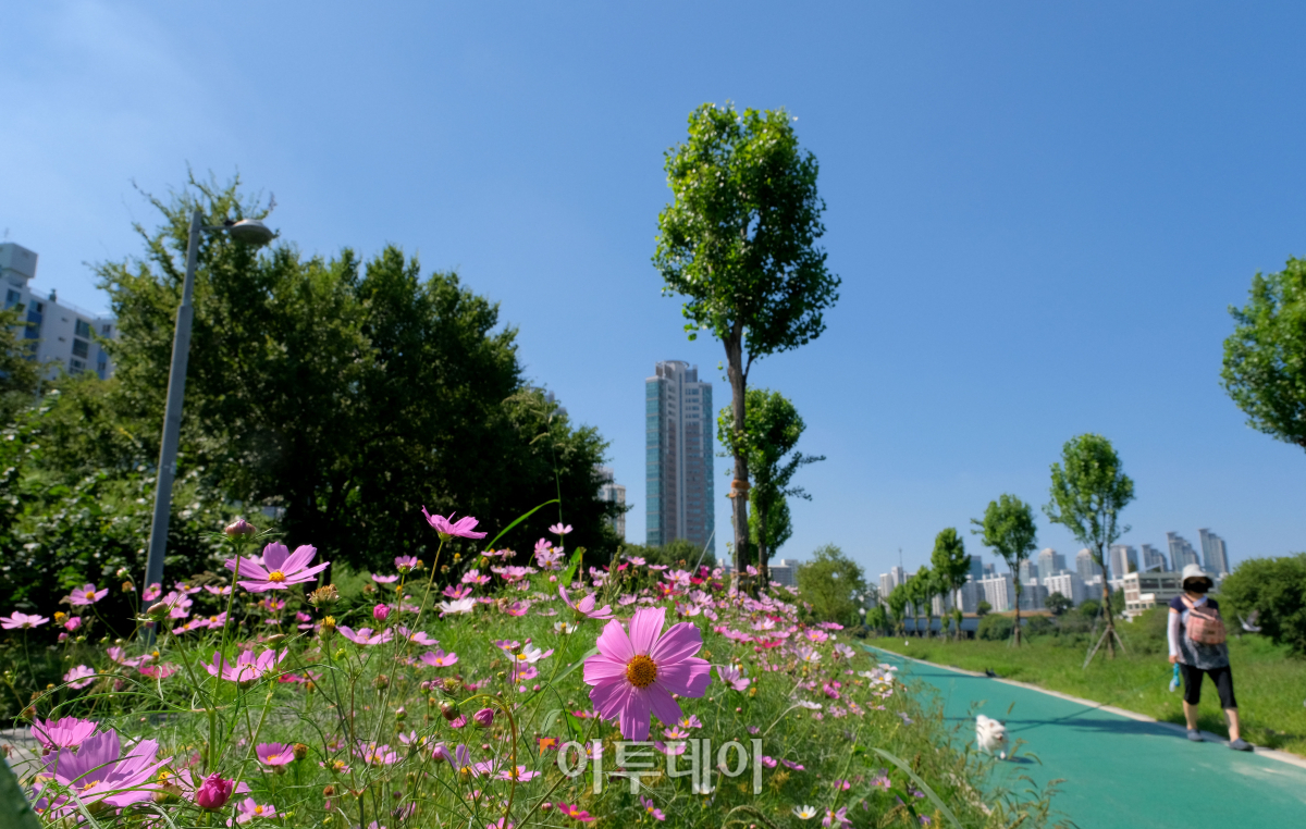 쾌청한 초가을날씨를 보인 12일 서울 구로구 도림천변에 핀 코스모스 곁에서 한 시민이 산책을 하고 있다.