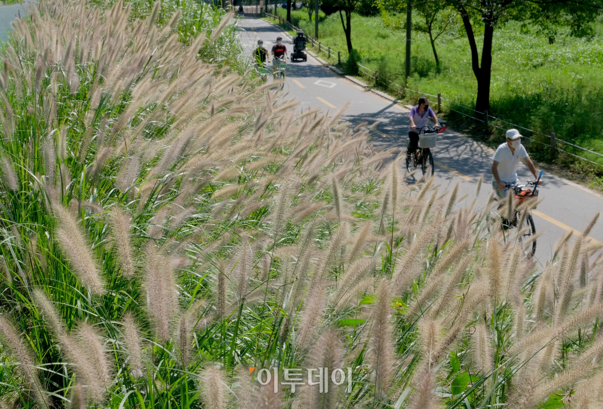 쾌청한 초가을날씨를 보인 12일 서울 영등포구 안양천변 수크령 군락곁에서 시민들이 자전거를 타고 있다.