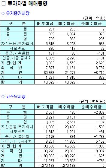 기관이 외국인과 매수에 나섰지만 개인투자자들의 6000억이 넘는 매도에 맥 못 춘 하루였다. 29일 기관은 코스피, 코스닥 양 시장에서 각각 2629억원, 120억여원 순매수했다.