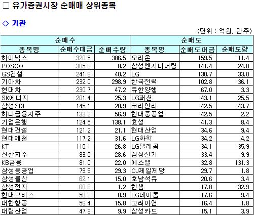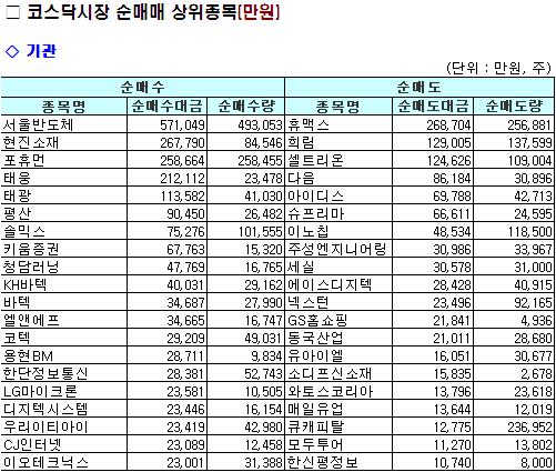 전날 상한가를 기록했던 하이닉스는 1.4% 하락 마감했지만 기관의 매수세는 이어졌다. 코스닥시장에 기관은 평산, 용현BM등 풍력 관련주에 대한 매수세를 이어갔다.