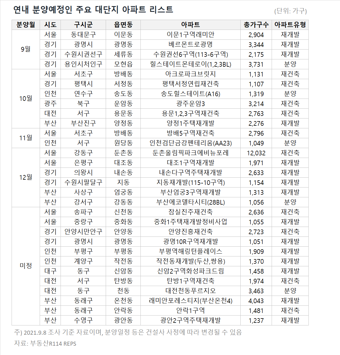4분기 분양이 가능한 대단지 아파트론 서울 강동구 둔촌동 '둔촌 올림픽파크 에비뉴포레(옛 둔촌주공아파트·1만2032가구)’·동대문구 이문동 '이문1구역 래미안(2904가구)'·서초구 방배동 ‘방배5구역(2796가구)’, 부산 동래구 온천동 '‘래미안 포레스티지(4043가구)', 대전 중구 ‘대전 천동 푸르지오(3463가구) 등이 꼽힌다.