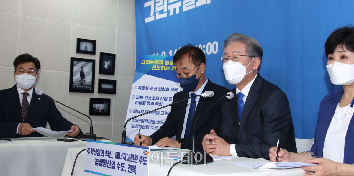 더불어민주당 대선주자인 이재명 후보(가운데)가 14일 서울 여의도 캠프에서 열린 전북 공약발표 기자간담회에서 기자들의 질문에 답변하고 있다.