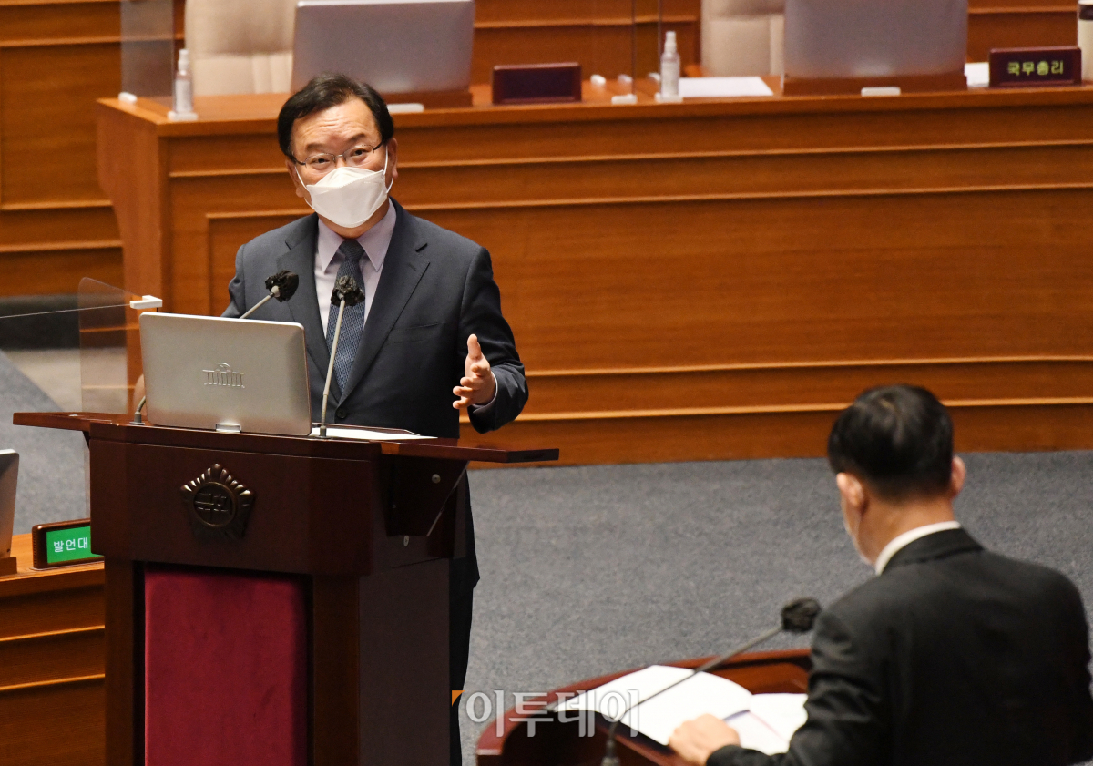 14일 국회 본회의장에서 제391회 정기회 외교.통일.안보에 관한 대정부질문이 열린 가운데 김부겸 총리가 국민의힘 신원식 의원의 질문에 답변하고 있다.