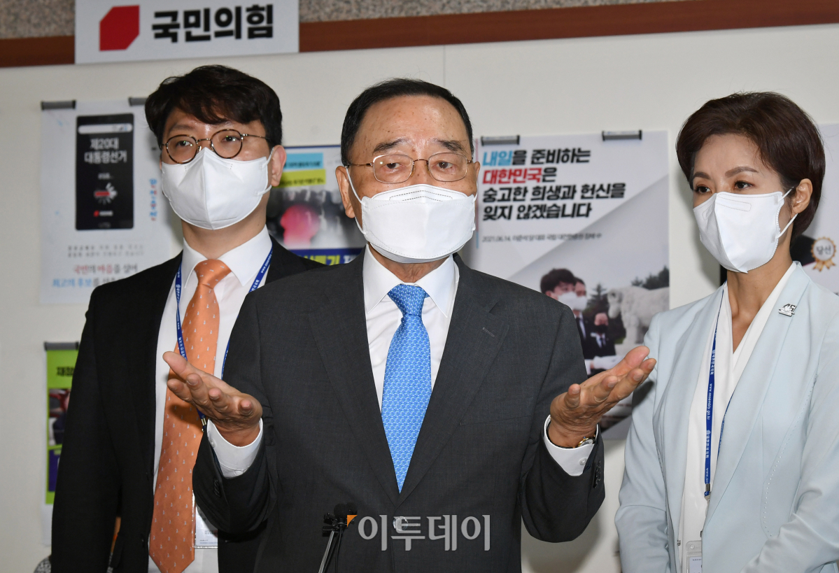 정홍원 국민의힘 선거관리위원장이 15일 국회에서 선관위 회의를 마치고 회의장을 나와 기자들의 질문에 답변하고 있다.