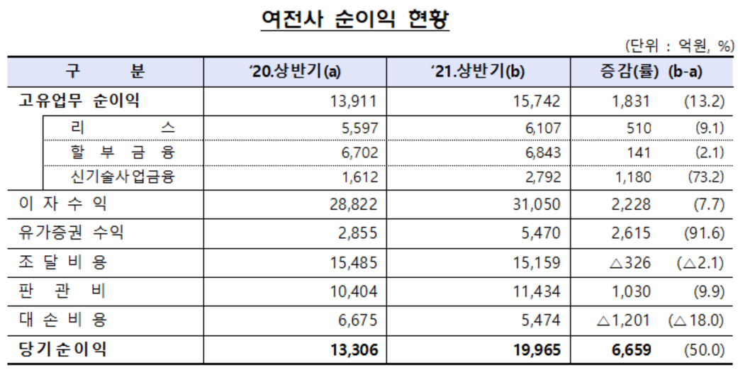 16일 금융감독원이 발표한 '2021 상반기 여신전문금융회사(신용카드사 제외) 영업실적' 자료에 따르면 올해 상반기중 여전사의 순이익은 1조 9965억 원으로 전년 동기(1조 3306억 원) 대비 50.0%(6659억 원) 증가했다.