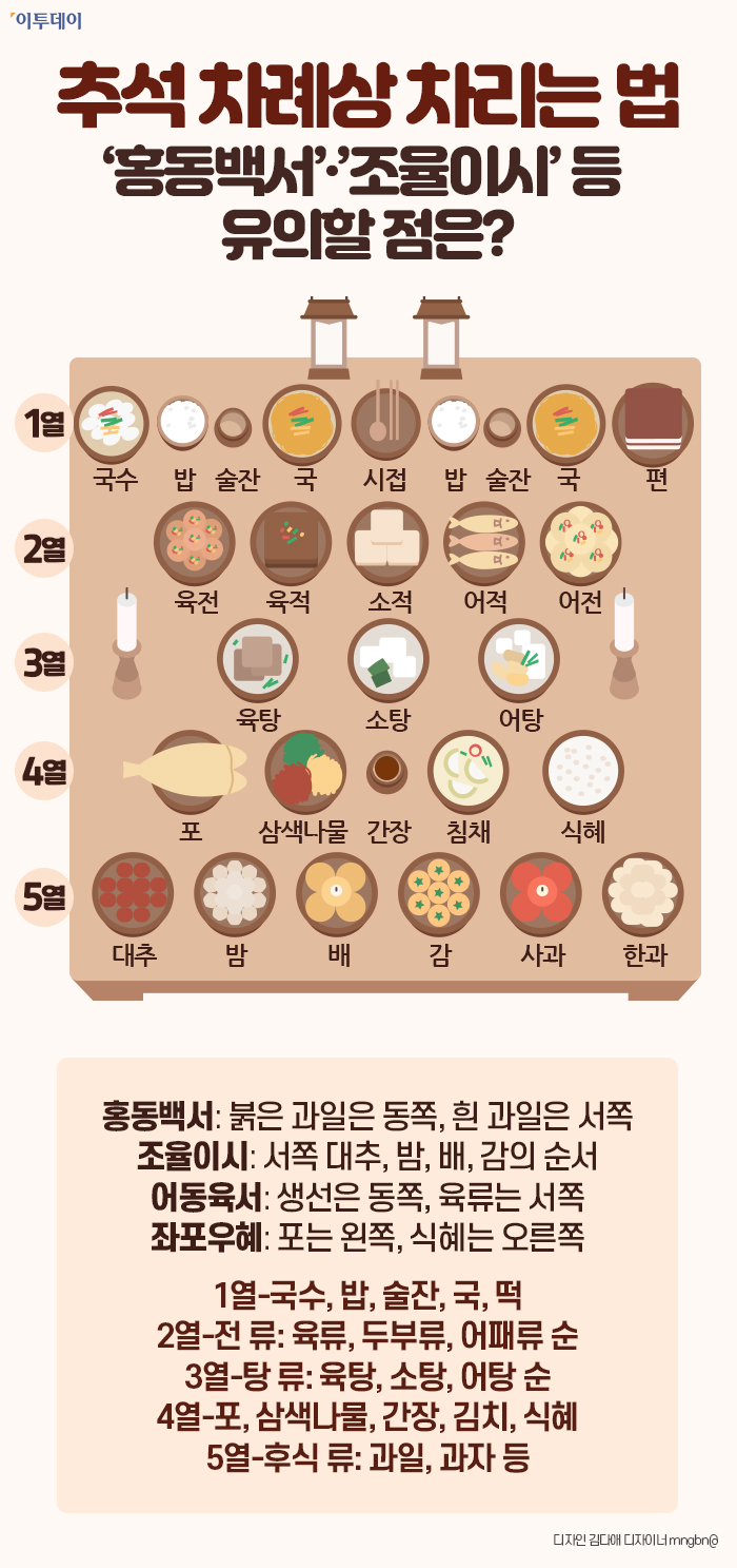 차례상 배열과 관련해 기억해야 할 것은 반서갱동(飯西羹東·밥은 서쪽이고 국은 동쪽), 적전중앙(炙奠中央·산적과 전은 중앙으로), 서포동혜(西脯東醯·포는 서쪽, 생선젓과 식혜는 동쪽), 홍동백서(紅東白西·붉은 색깔 과일은 동편, 하얀색 과일은 서편), 어동육서(魚東肉西·어류는 동편, 육류는 서편), 두동미서(頭東尾西·생선의 머리는 동쪽으로 꼬리는 서쪽으로), 동조서율(東棗西栗·대추는 동쪽, 밤은 서쪽), 조율이시(棗栗梨柿·대추, 밤, 배, 감을 서쪽에서 동쪽으로), 배복방향(背腹方向·닭구이나 생선포는 등이 위로 향한다) 등이 있습니다.