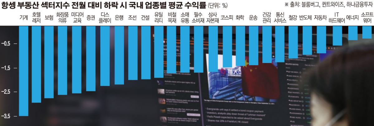 헝다 그룹의 파산 우려가 불거지면서 세계 증시는 먼저 충격을 받았다. 헝다그룹 파산설이 확대됐던 지난 20일 항셍지수는 3.3% 떨어졌다. 스탠다드앤드푸어(S&P500)와 나스닥(NASDAQ)도 전장보다 각각 1.7%, 2.2% 내려가면서 미국 증시도 약세를 보였다.