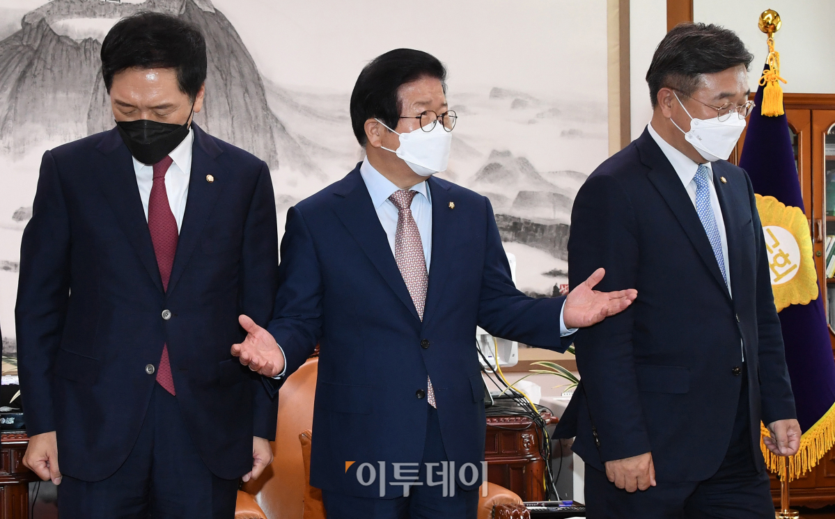 더불어민주당 윤호중 (오른쪽)원내대표와 국민의힘 김기현(왼쪽) 원내대표가 28일 오전 국회에서 열린 박병석 국회의장 주재 언론중재법 관련 회동에서 포토타임을 마친 뒤 자리로 향하고 있다.