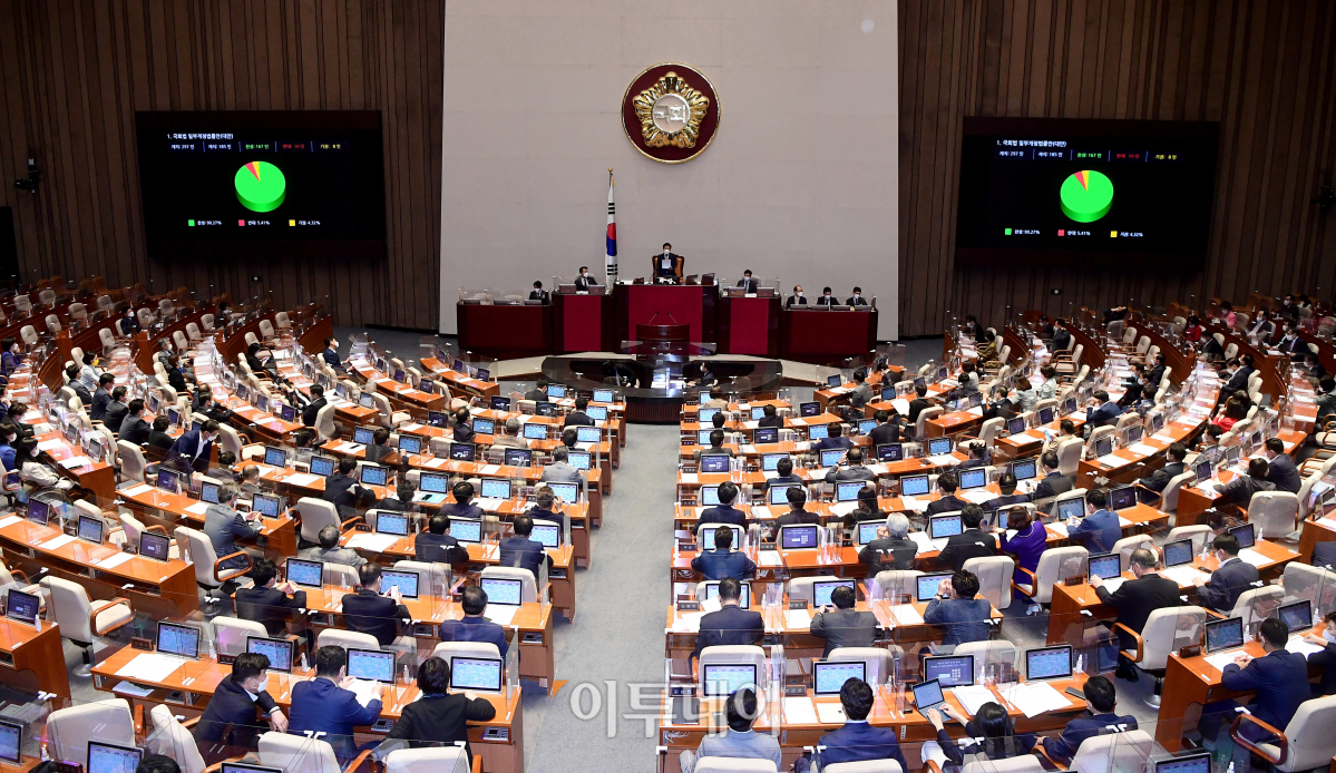 28일 서울 여의도 국회에서 열린 본회의에서 세종시에 국회의사당 분원을 설치하는 내용의 국회법 개정안이 통과되고 있다.