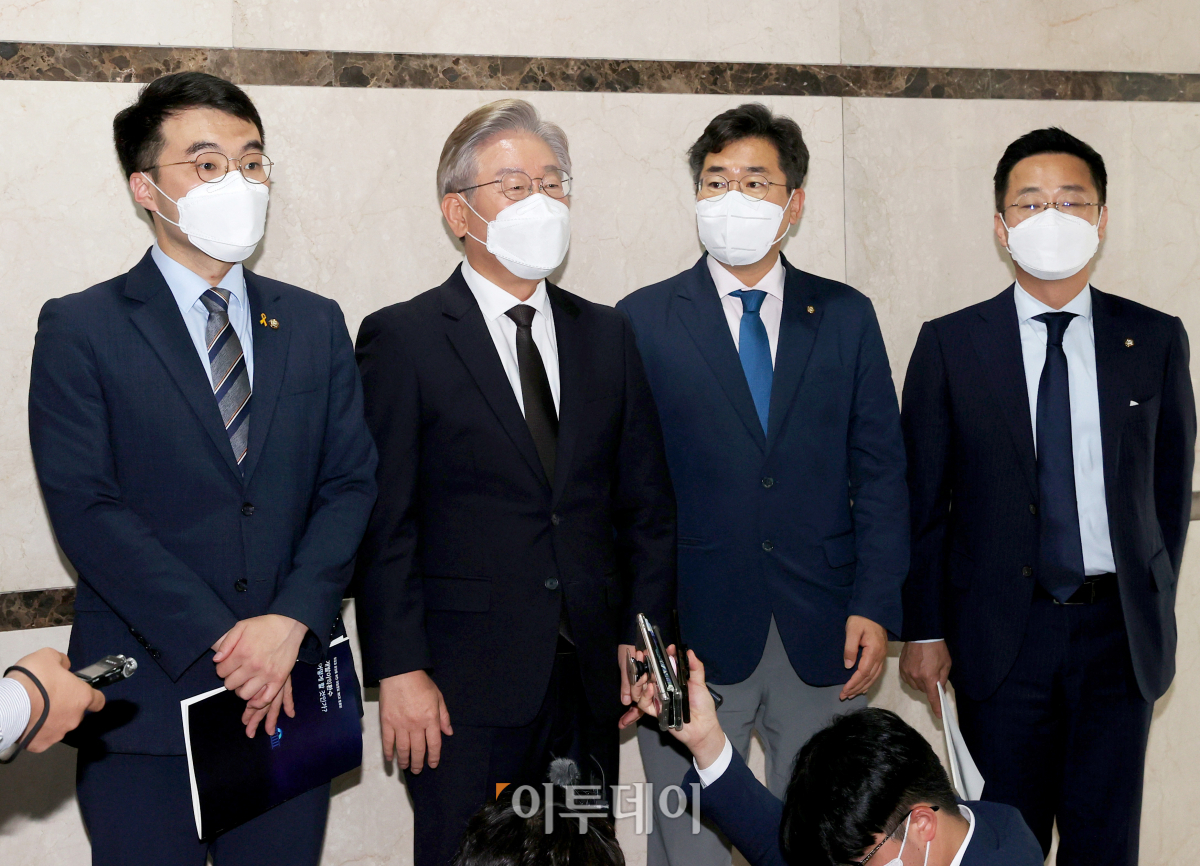 더불어민주당 대선 예비후보 이재명 경기도지사가 28일 서울 여의도 중앙보훈회관에서 열린 개발이익 환수 법제화 긴급토론회에서 축사를 마치고 나와 취재진의 질문에 답하고 있다.