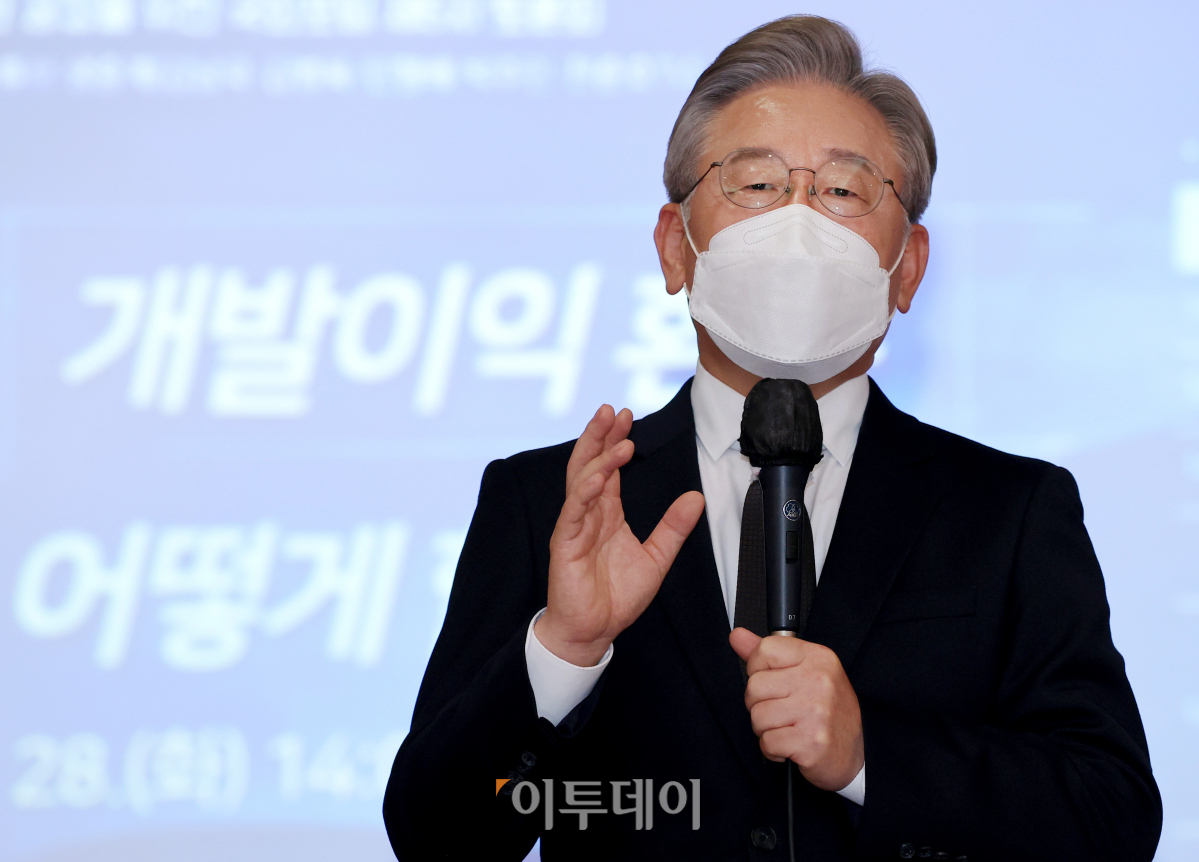 더불어민주당 대선 예비후보 이재명 경기도지사가 28일 서울 여의도 중앙보훈회관에서 열린 개발이익 환수 법제화 긴급토론회 ‘개발이익 환수 어떻게 할 것인가?’에서 축사를 하고 있다.