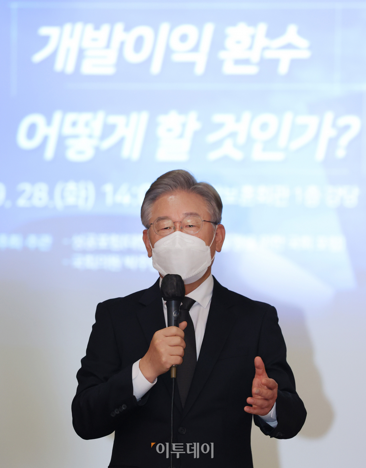 더불어민주당 대선 예비후보 이재명 경기도지사가 28일 서울 여의도 중앙보훈회관에서 열린 개발이익 환수 법제화 긴급토론회 ‘개발이익 환수 어떻게 할 것인가?’에서 축사를 하고 있다.