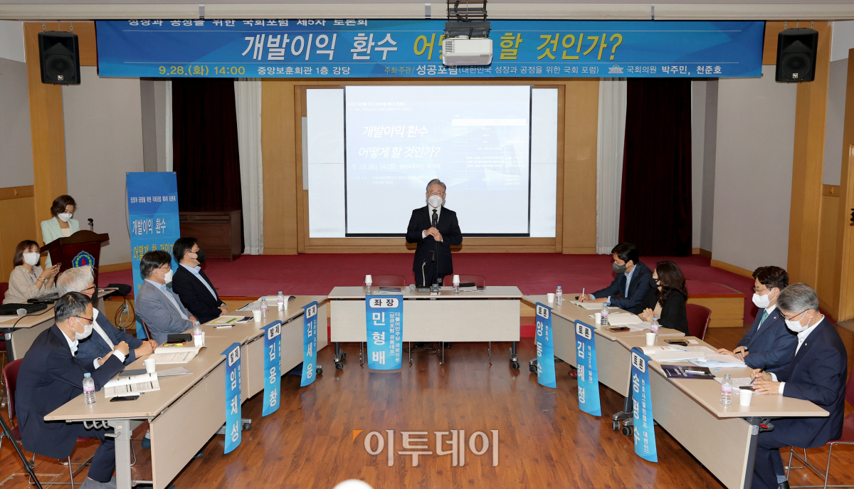 더불어민주당 대선 예비후보 이재명 경기도지사가 28일 서울 여의도 중앙보훈회관에서 열린 개발이익 환수 법제화 긴급토론회 ‘개발이익 환수 어떻게 할 것인가?’에서 축사를 하고 있다.