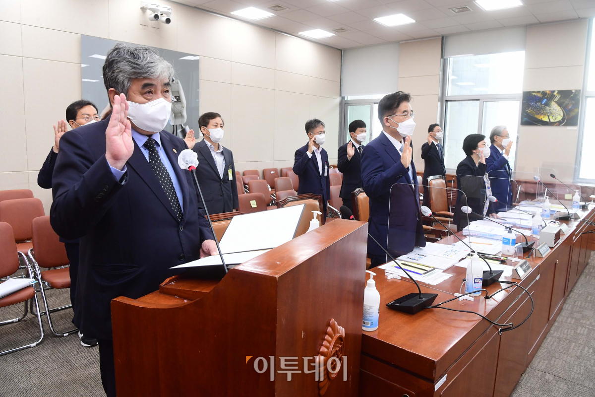 5일 서울 여의도 국회에서 열린 과학기술정보방송통신위원회의 방송통신위원회 국정감사에서 한상혁 방송통신위원장이 선서를 하고 있다.