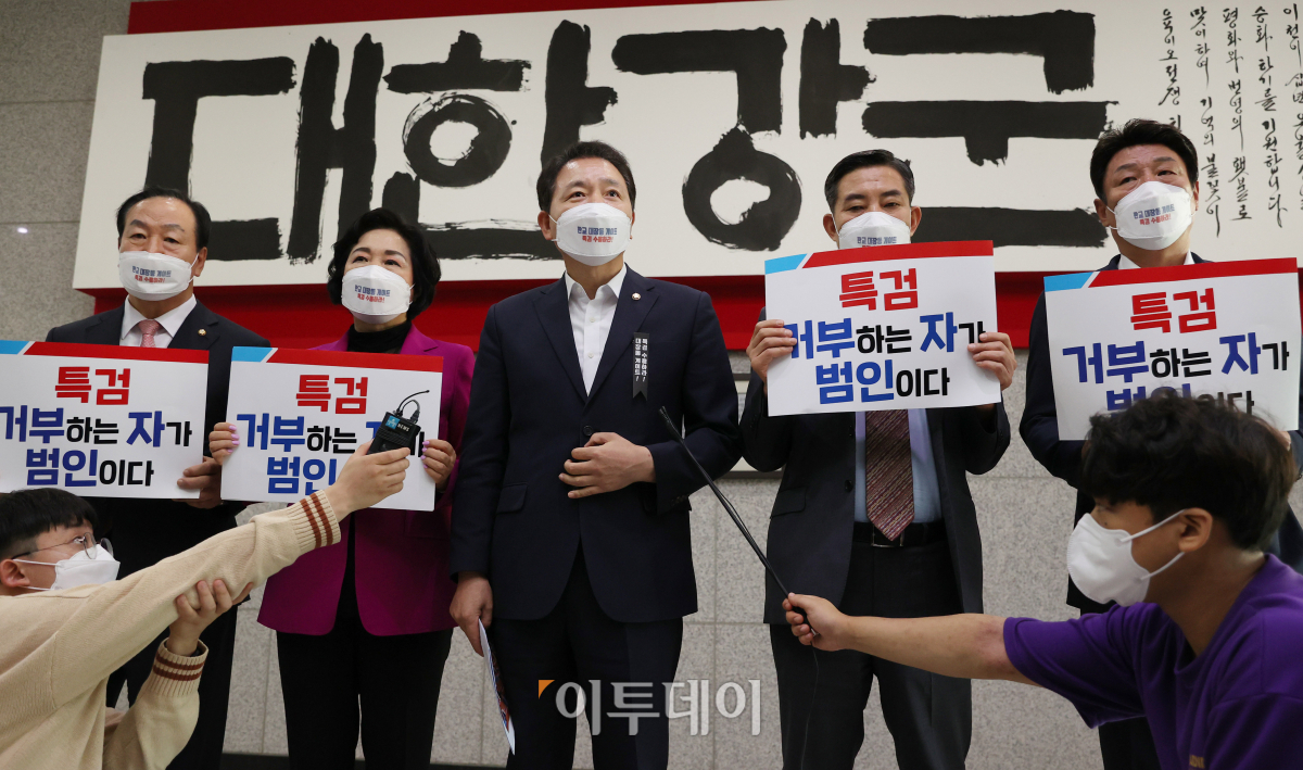 성일종 국방위 국민의힘 간사를 비롯한 의원들이 5일 서울 용산구 국방부 대회의실에서 열린 국회 국방위원회의 국방부 등에 대한 국정감사의 파행과 관련해 기자회견을 하고 있다. 이 날 오전 국방위 국정감사는 대장동 개발 의혹을 둘러싼 공방과 피켓 등으로 파행을 겪고 있다. 국회사진취재단