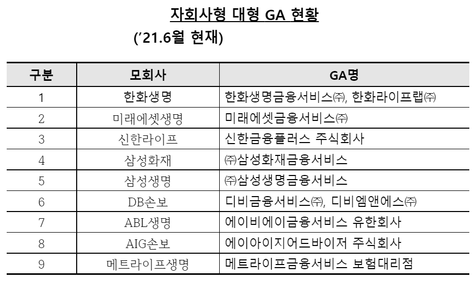 6일 금감원에서 입수한 자료에 따르면 올해 6월 말 현재 GA는 총 4501개사이며, 이중 소속 설계사가 500명 이상인 대형 GA는 총 61개사로 전체의 1.4%이다. 그러나 설계사(16만3000명, 전체의 38.5%), 보험사로부터 받는 보험료 수입(88.4%) 등은 점차 대형 GA로 집중되고 있다. 기존 생·손보사의 자회사형 대형 GA도 총 11개이다.