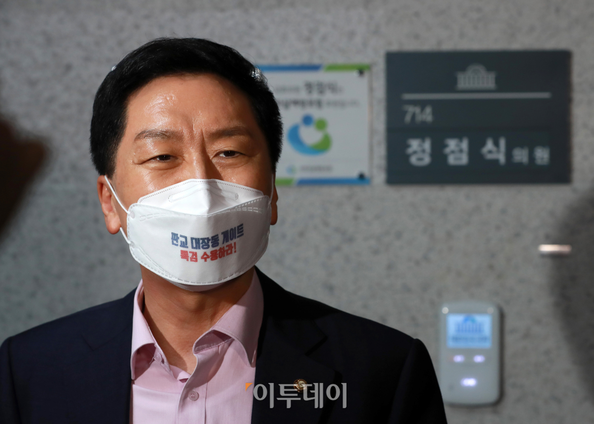 '고발사주 의혹'을 수사 중인 고위공직자범죄수사처(공수처)가 6일 오전 서울 여의도 국회의원회관에서 정점식 국민의힘 의원 사무실에 대한 압수수색을 진행중인 가운데 김기현 원내대표가 입장을 밝히고 있다.