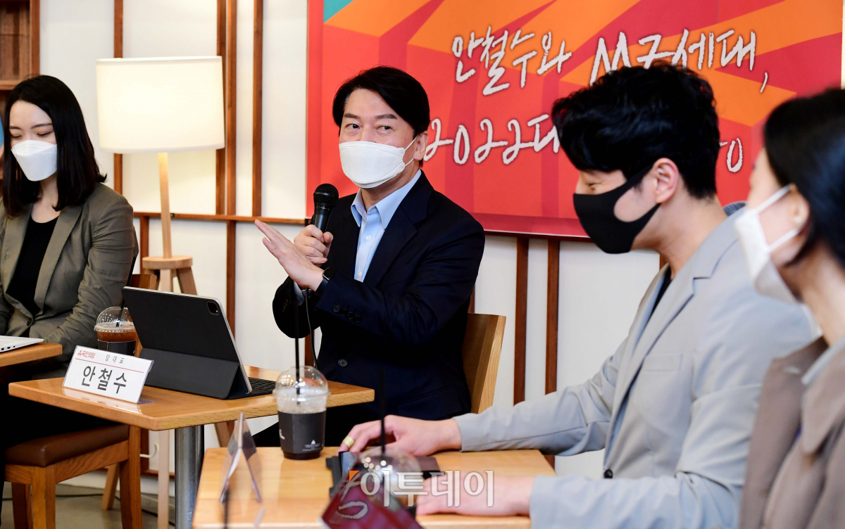 안철수 국민의당 대표가 6일 서울 여의도 정치카페 하우스에서 열린 ‘안철수 국민의당 대표 MZ세대 기자단 초청간담회’에서 기자들과 대화하고 있다.