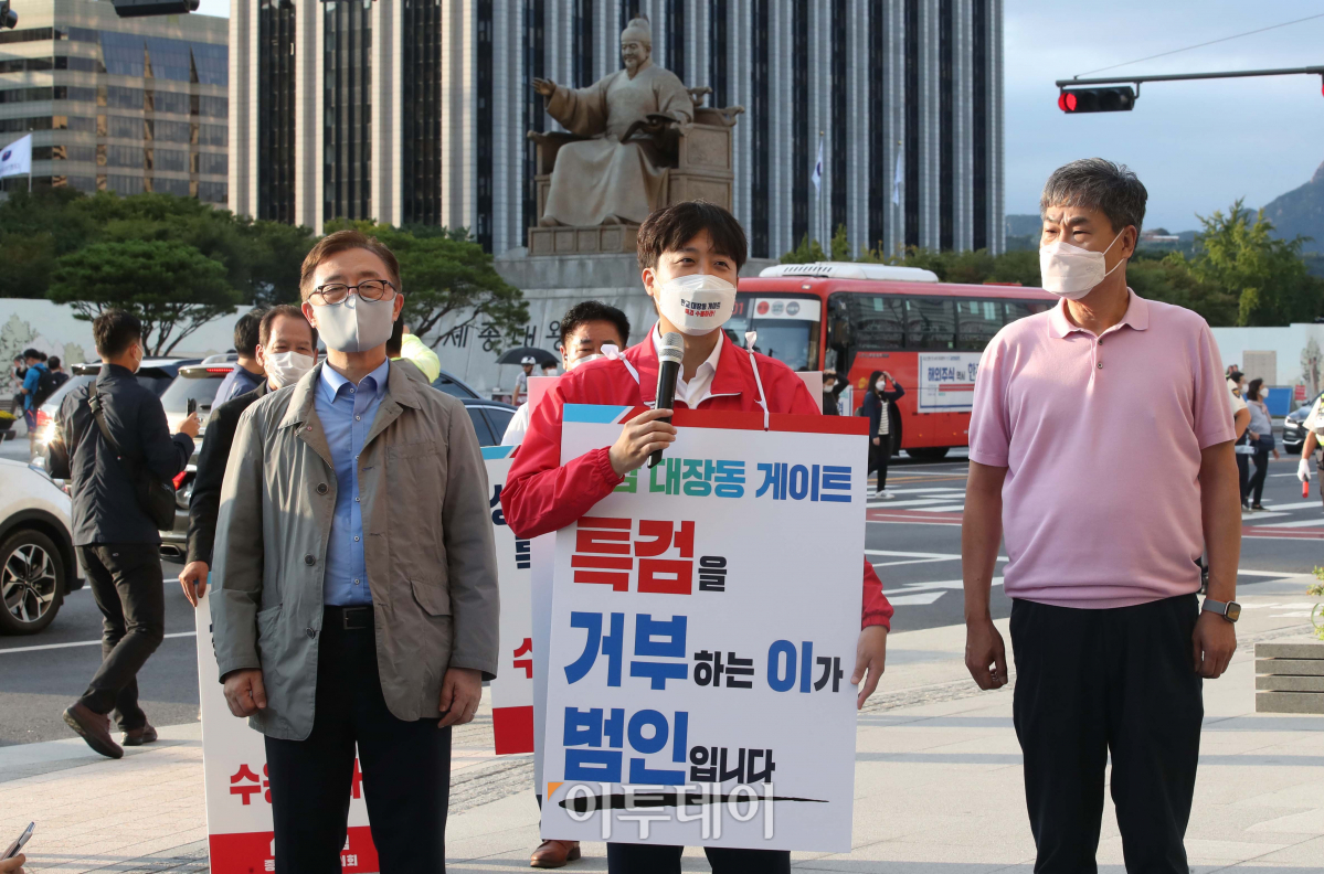 이준석 국민의힘 대표가 6일 ‘대장동 의혹 진상 규명을 위한 특검 도입을 촉구하는 도보 투쟁’을 진행하며 서울 광화문 일대에서 발언하고 있다. 국회사진취재단