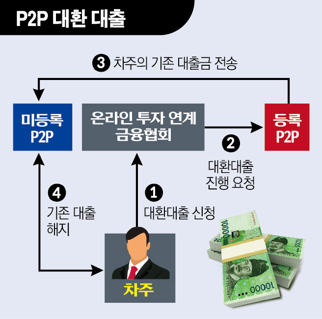 ◇떠밀어놓고 뒷짐진 금감원= 대환대출 신청 건수가 ‘0’인 상황에 대해 금감원 관계자는 “그건 협회에서 하는 사업이라 금감원이 특별히 개입하고 이런 건 아니다”라며 “굳이 금감원이 나설 이유는 없다”고 말했다. 하지만 1금융권 가계대출을 옥죄며 돈이 필요한 사람을 제도권 밖으로 몰았던 금융당국이 이제와 미등록 P2P 업체 투자금의 미회수 가능성에 대해 ‘나 몰라라’ 하는 건 적절치 않다는 지적이다.