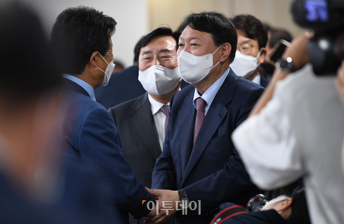 국민의힘 대선 예비후보인 윤석열 전 검찰총장이 7일 서울 여의도 중소기업중앙회에서 열린 '윤석열 대선예비후보와 중소기업인 대화'에서 김기문 중소기업중앙회장 등 참석자들에게 인사하고 있다.