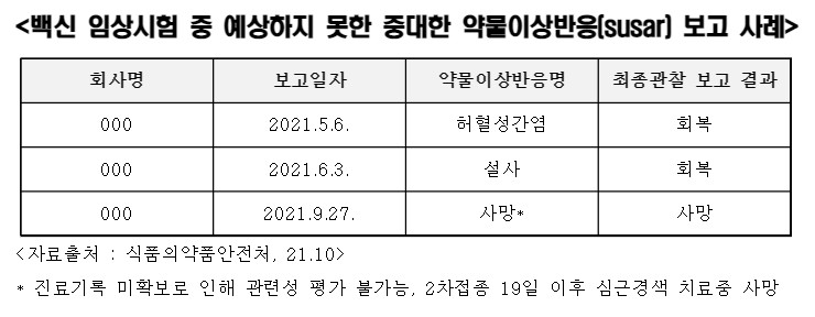 강 위원이 식약처로부터 받은 ‘백신 임상시험 중 예상하지 못한 중대한 약물이상반응(susar) 보고 사례’에 따르면 올해 9월 모 기업에서 실시했던 임상시험 중 심근경색 부작용으로 인해 사망자가 발생했지만 여전히 임상시험을 진행하고 있는 것으로 나타났다.